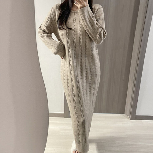 글램핏 / 로맨틱 꽈배기 라운드 루즈핏 케이블 부드러운 니트 롱 원피스 3컬러