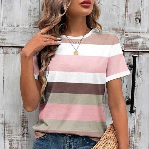 [굿쇼핑몰_의류]모던 내추럴 핑크 스트라이프 라운드넥 반팔 티셔츠