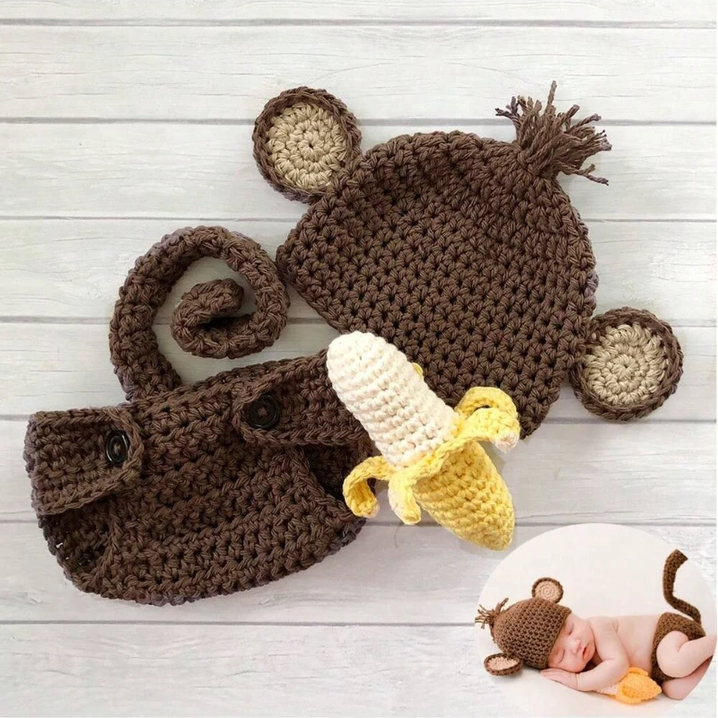 신생아 원숭이 크로셰 의상: 모자, 기저귀 커버 및 바나나 세트 - 아기 사진 소품, 수제 동물 포즈 의상