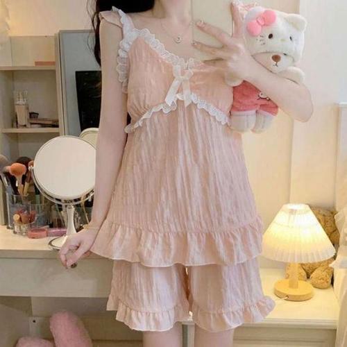 [셀러허브_여성트랜드패션]ONM 여성 여름 잠옷 프릴 핑크 나시 반바지 파자마