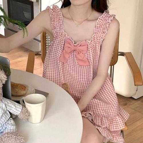 [셀러허브_여성트랜드패션]ONM 여성 여름 잠옷 프릴 체크 핑크 나시 반바지 파자마