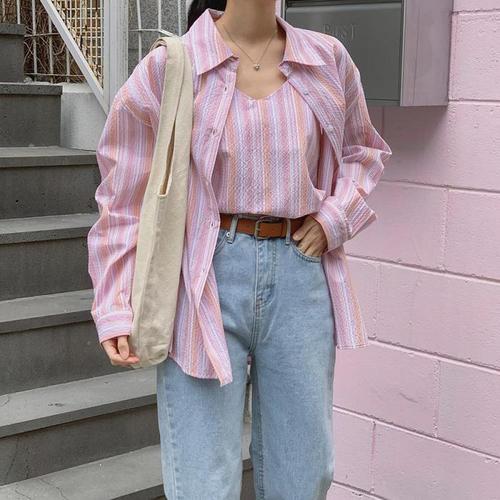 MOMOKA 파스텔셔츠남방 스트라이프셔츠 줄무늬셔츠 빅사이즈 오버핏