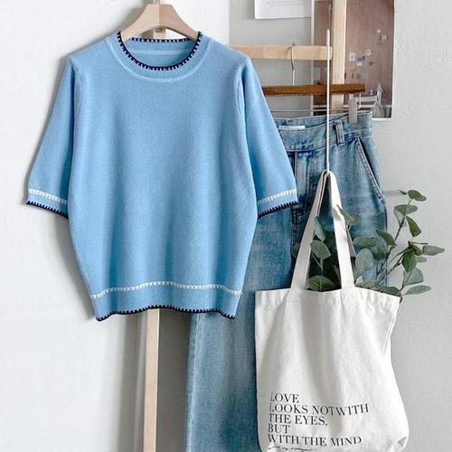[신상오픈런]반팔니트 라운드 스트라이프 테두리 자켓이너티 하늘색 (31612791)