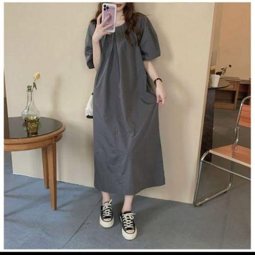[에이치플러스몰]퍼프소매 절개 화이트 차콜 롱원피스