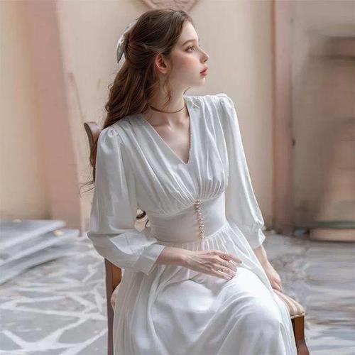 [교복몰]순백 화이트 브이넥 진주디테일 롱원피스 경성의상