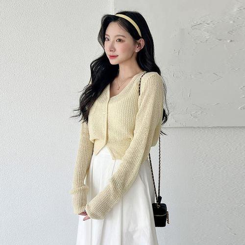 [유야]6컬러 썸머 시스루 브이넥 하찌 긴팔 크롭 니트 가디건 -VC0100H- 여성 봄 여름