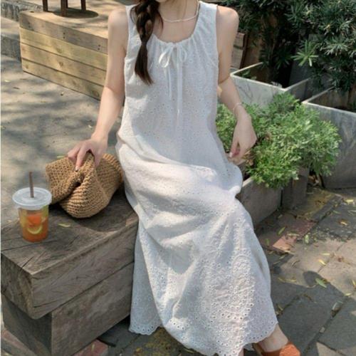 [오너클랜]인기상품 스트링 프릴 나시 롱원피스 펀칭 비치 해변 휴가룩 자수 리본원피스 [WFLHT2B_260208]