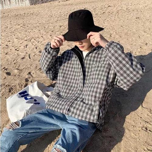 [셀럽하우스]남자 WOON2120 공항 패션 해외 여행 룩 체크 양면 점퍼 코디