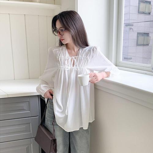 [신상오픈런]여성용 기본 브이넥 루즈핏 셔링 블라우스 데일리용