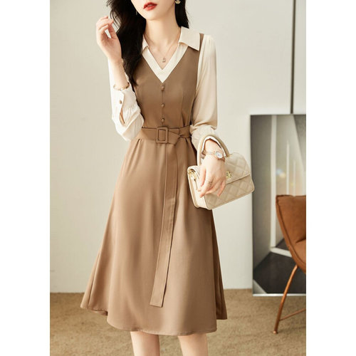 Hasvz봄 여성 원피스 롱스커트 네크라인 신상 빈티지 허리 조임 기품 롱스커트