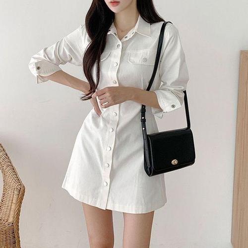 [ab.f.z]AFZ4HO32/깔끔 셔츠형 캐주얼 소매 7부 허리 라인 벨티드 플레어 롱 원피스_IC