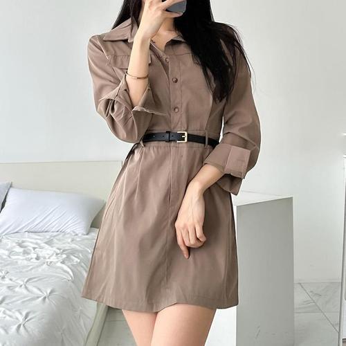 포인트 허리 벨트 여성 셔츠 롱 원피스