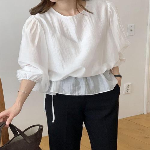 [헤레이스]이중 레이어드 스트링 블라우스_YMSH26SS033