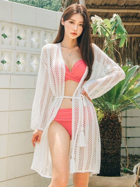 [헤링본] 시스루 프릴 로브 가디건 원피스 수영복 커버업 / SD125