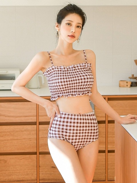 [헤링본] 러블리 체크 하이웨스트 비키니 프릴 수영복 / CD213
