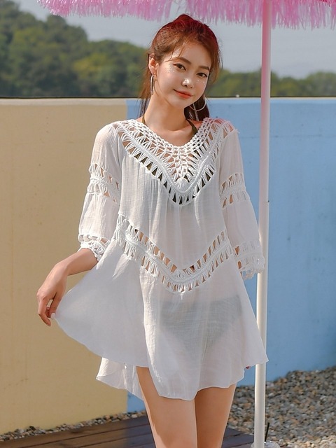 [헤링본] 7부 펀칭 수영복 비키니 루즈핏 커버업 티셔츠 비치웨어_2color / SD128