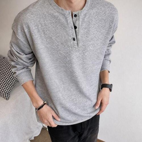 남자 와플 헨리넥 버튼 라운드 긴팔 티셔츠 OF-TSA-Q015-블랙