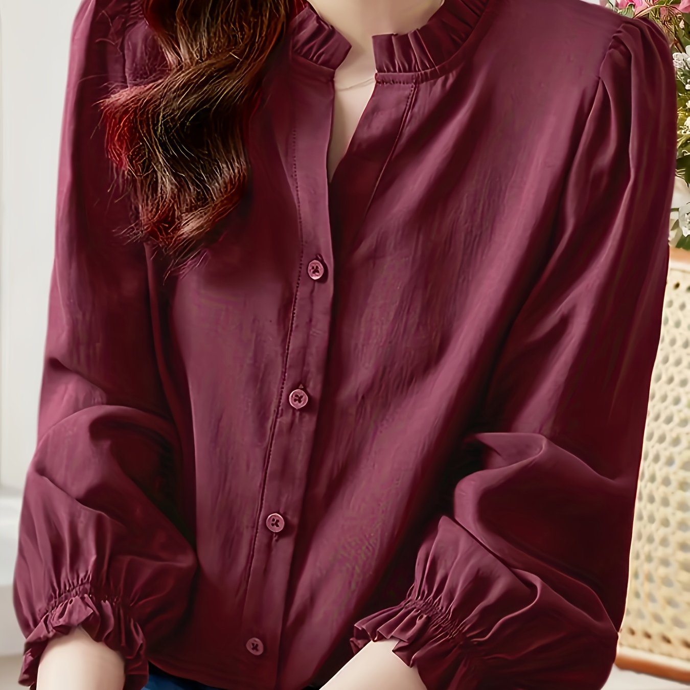 TEMU 여성용 엘레강스 브이넥 긴소매 러플 셔츠 - 단색 사무실 및 캐주얼 블라우스, 레귤러핏 봄/가을용 상의, 편안한 핏 브이넥 셔츠