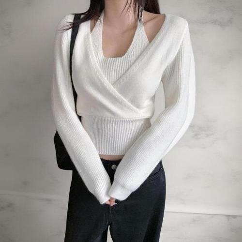 [옷자락]여자 홀터넥 골지 나시 레이어드 랩 크롭 니트
