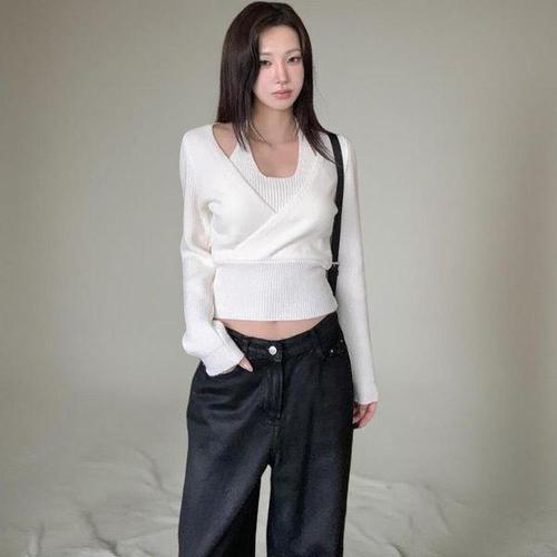 [옷자락]여자 홀터넥 골지 나시 레이어드 랩 크롭 니트