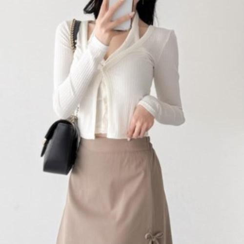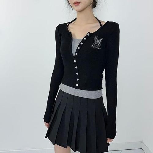 [엄지척]나비 자수 넥 스트랩 홀터 레이어드 골지 긴팔티셔츠_19599238_667501