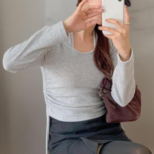[옷자락]여자 홀터넥 라운드 옆셔링 크롭 골지 긴팔 티셔츠