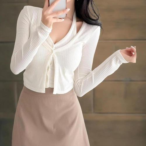 [신상오픈런]|CCD2309|홀터넥 글램 원버튼 슬림 골지가디건 크롭나시티 세트_19607645_597559