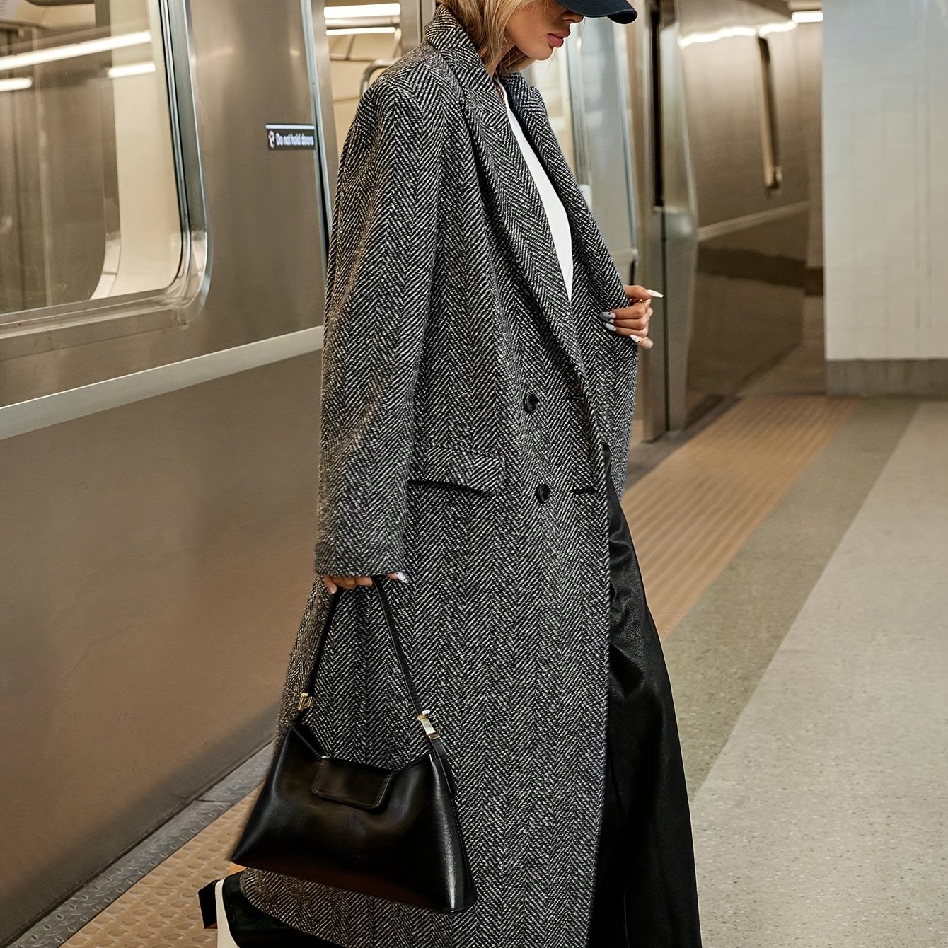 TEMU 가을 겨울 여성용 패션 롱 코트, 더블 브레스티드 우아한 롱 아우터웨어