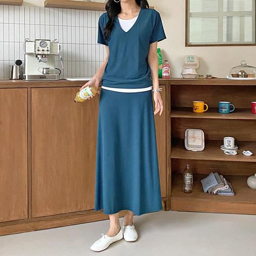 [유야]여성 레이어드 반팔티 H라인 롱스커트 세트 -FSST0022- 봄 여름