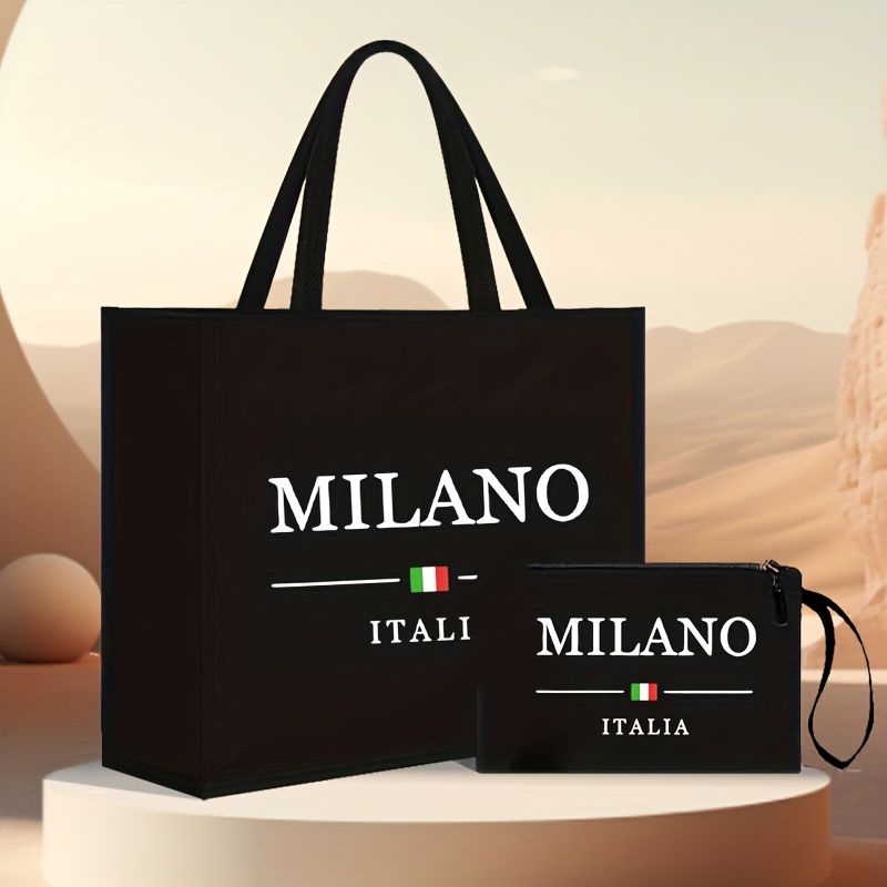 TEMU 화이트 레터 프린트 시리즈, 패셔너블한 감각의 블랙 핸드백 2개 세트, 친구, 직장, 일상용, 여행 및 해변용으로 적합