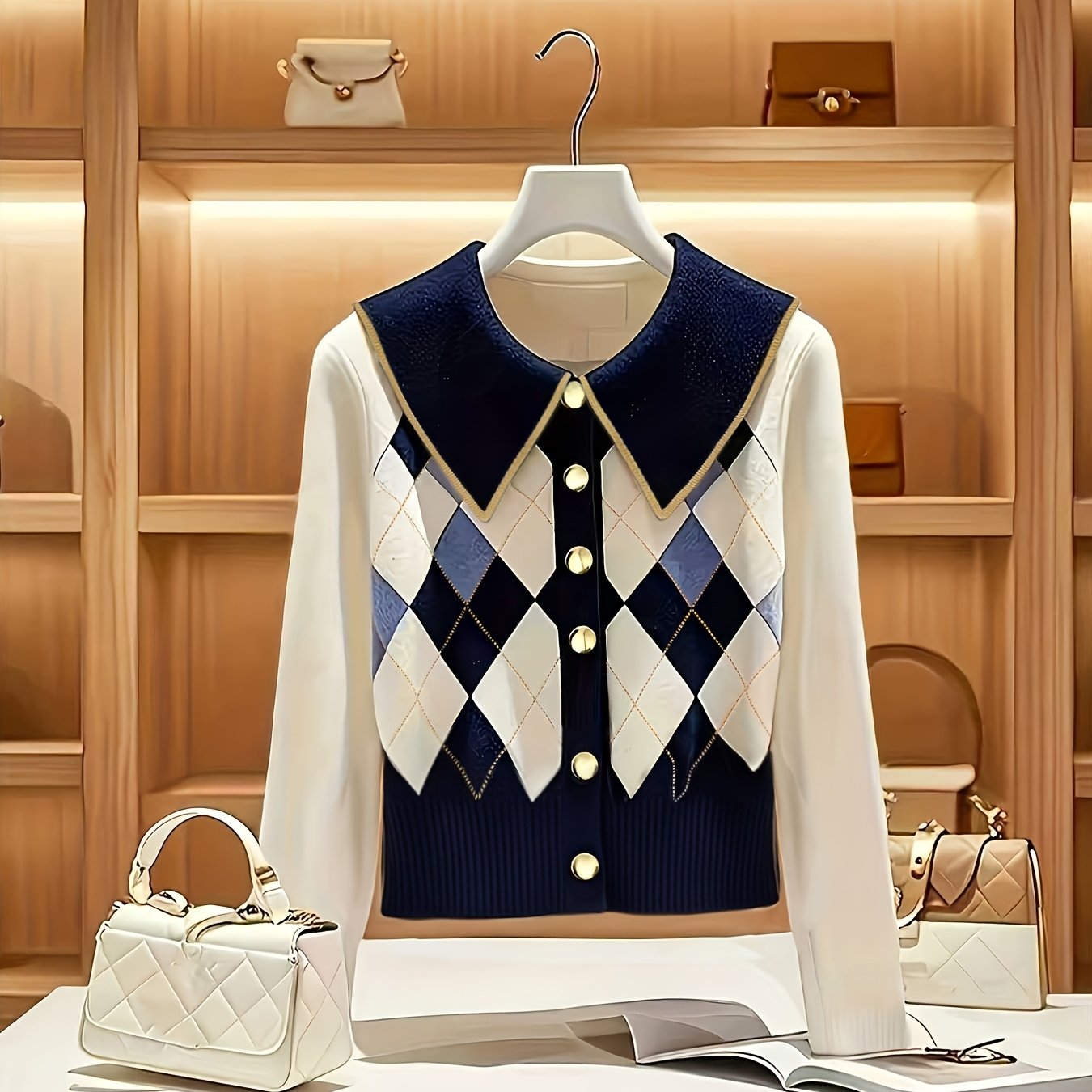 TEMU 여성용 블루 & 화이트 체크 카디건 - 캐주얼 롱 슬리브 버튼업 러플 칼라, 봄 & 가을에 완벽한 스타일리시 레이어링 피스, 캐주얼 웨어 카디건 | 러플 칼라 카디건 | 버튼업 카디건