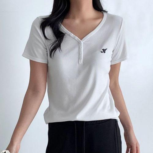 [에이치플러스몰]여성 버튼 세로 골지 반팔티 1P 데일리 여름 티셔츠