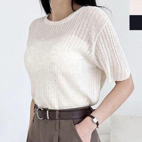 [에이치플러스몰]여성 인기 반팔 라운드 골지 감성 니트티 1P 가벼운