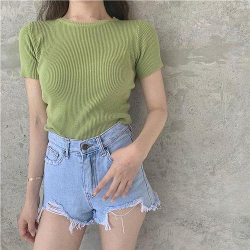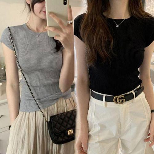 [에이치플러스몰]여성 얇은 골지라인 넥라운드 캡 소매 반팔 니트 티
