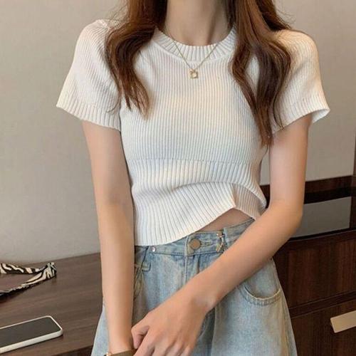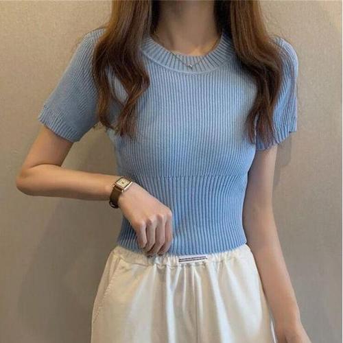 [에이치플러스몰]여성 크롭 골지 라운드 반팔 니트 1P 슬림핏 티셔츠
