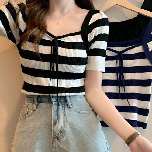 [에이치플러스몰]여름 스퀘어넥 니트티 골지 스트라이프 여성 반팔
