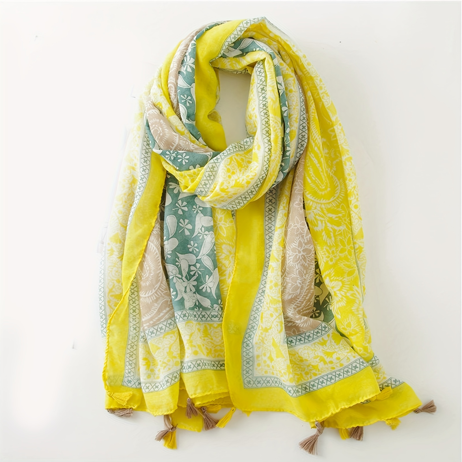 TEMU 1개 여성용 엑스트라 롱 70.87x35.43인치 우아한 플로럴 프린트 스카프 - 럭셔리 소프트 경량 샤울, 헤드스카프 & 비치 타월 - 공식/캐주얼 의상용 논스트레치 우아한 랩 - 옐로우 & 블루 꽃무늬 패턴 사계절 액세서리 - 쉬운 관리 우아한 여성 패션 액세서리, 다용도 스타일링, 세련된 디자인, 원단, 트렌디한 스카프, 고품질