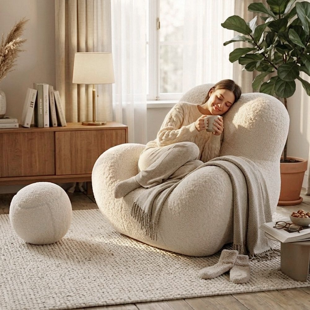 1인용 게으른 소파 의자 화장 의자 양모 의자 거실 심플 모던 라이트 럭셔리 발코니 휴식 의자, 화이트, 1개