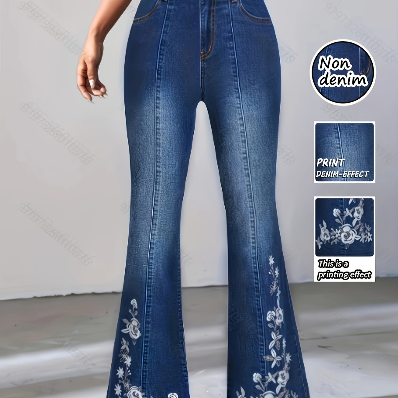 TEMU [프린트 팬츠 - 데님 원단 아님] 플로럴 디자인의 프린트 여성용 신축성 있는 롱 팬츠, 페이크 데님 스타일, 페이크 포켓 및 핏되는 플레어 컷