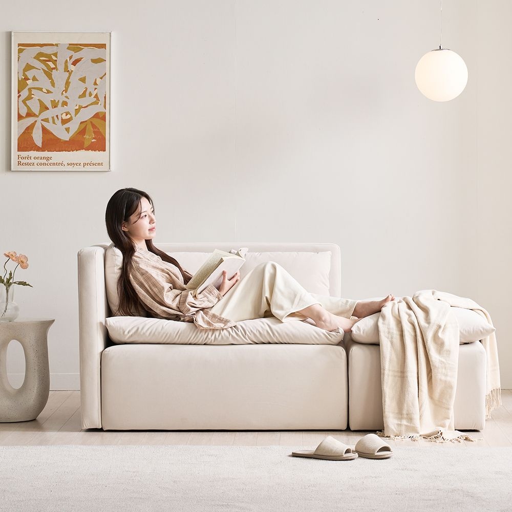 [쿠폰가 19.9만] 큐브 2인용 필로우탑 패브릭 소파 (스툴 + 쿠션 증정)