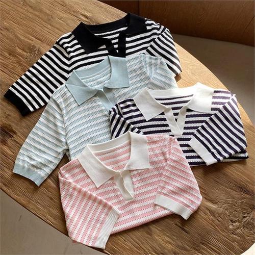 [다잇템]여자 콘트라스트 SS 반소매 카라 단가라 니트 (9947015A)
