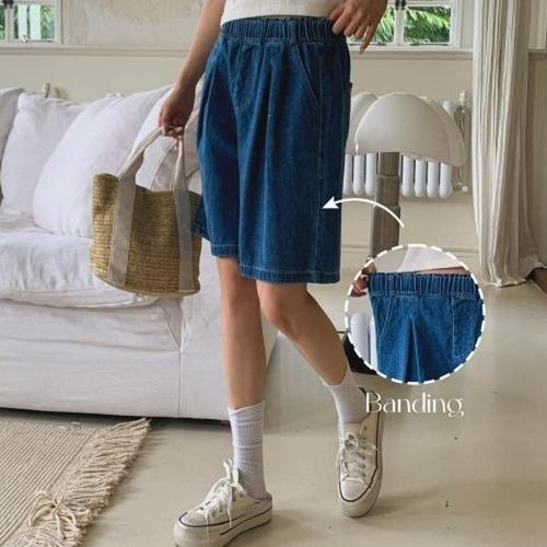 [옷자락]여자 캐주얼 면혼방 비스코스 핀턱 밴딩 4부 데님