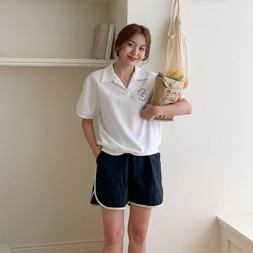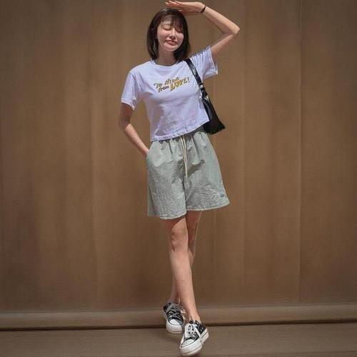[옷자락] 여자 키치무드 자수 레터링 바스락 4부 밴딩 반바지