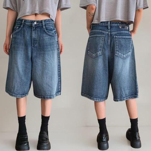 |KHP8BD8|여성 스트리트 스타일 스티치 와이드핏 5부 데님 반바지