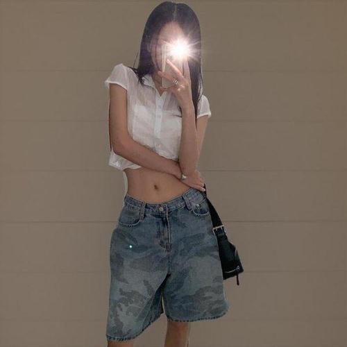 [신상오픈런]여성 카모프린트 워싱 5부 버뮤다 데님 팬츠