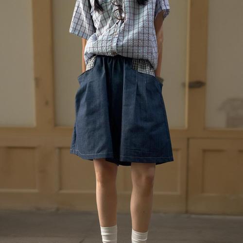 [옷자락] 여자 스트릿패션 스티치 와이드핏 버뮤다 5부 데님