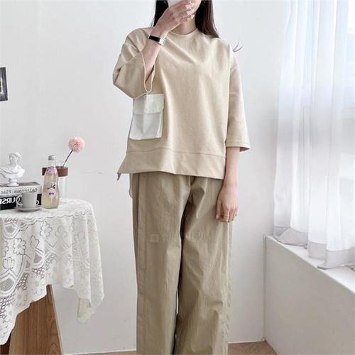 [다잇템]여자 코디 민무늬 셋업 칠부반팔 티셔츠 (8157097A)