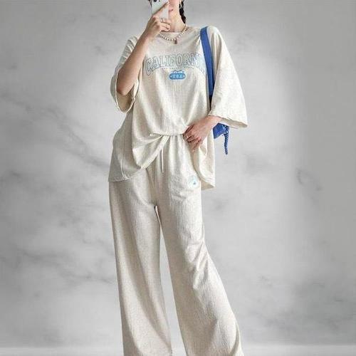 [신상오픈런]여성용 박시 프린트 7부 반팔티와 와이드핏 밴딩팬츠 세트