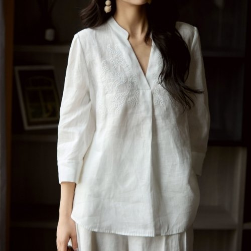 여성 클래식 린넨 브이넥 7부 프릴 블라우스