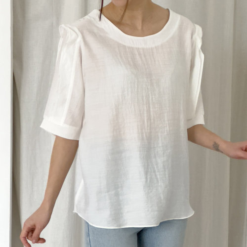 [셀러허브_여성트랜드패션]ONM F007300_라운드 단추포인트 7부 린넨블라우스 티셔츠